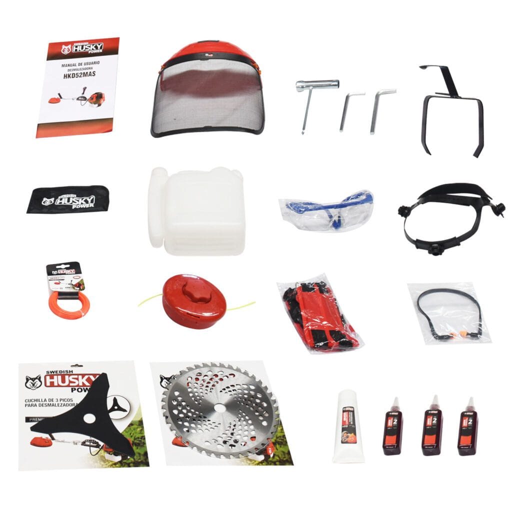 Incluye: cuchilla de 3 picos, disco de corte, 2 cabezales con fácil enrollado de hilo, rollo de hilo, arnés, careta, protección auditiva, googles, recipiente de mezcla, soporte para pared, kit de herramientas, juego de adaptadores para cuchilla y cabezal, 3 frascos de 100ml de aceite mineral y 30g de grasa lubricante para carcasa de engranes.