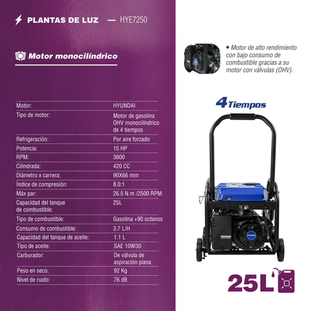 Generador de luz Profesional con potencia máxima de 7,200 watts marca HYUNDAI. Motor de gasolina de 4 tiempos con 15 hp y arranque manual/eléctrico. Sistema automático de apagado por bajo nivel de aceite para proteger el motor. Equipado con AVR (regulador ajustable de voltaje). Protección de sobrecarga al detectar voltaje o revoluciones excesivas. Montado sobre un resistente bastidor tubular, incluye manubrio y ruedas para su fácil transportación dentro de espacios de trabajo reducidos. Bajo consumo de combustible y bajo costo de mantenimiento.