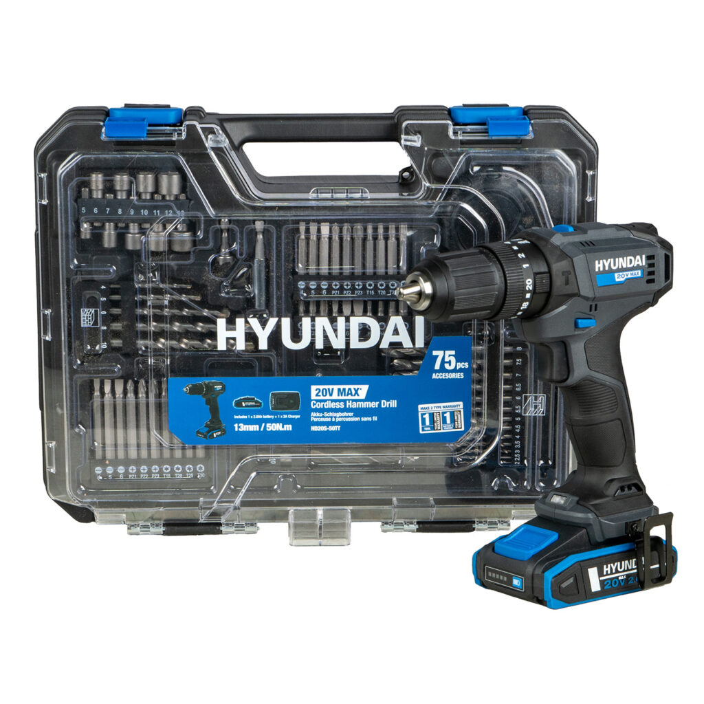 Kit Taladro Profesional Con Batería Li-ion Hyundai 20v + Cargador + Estuche + 75 Accesorios – HD20S-50TT