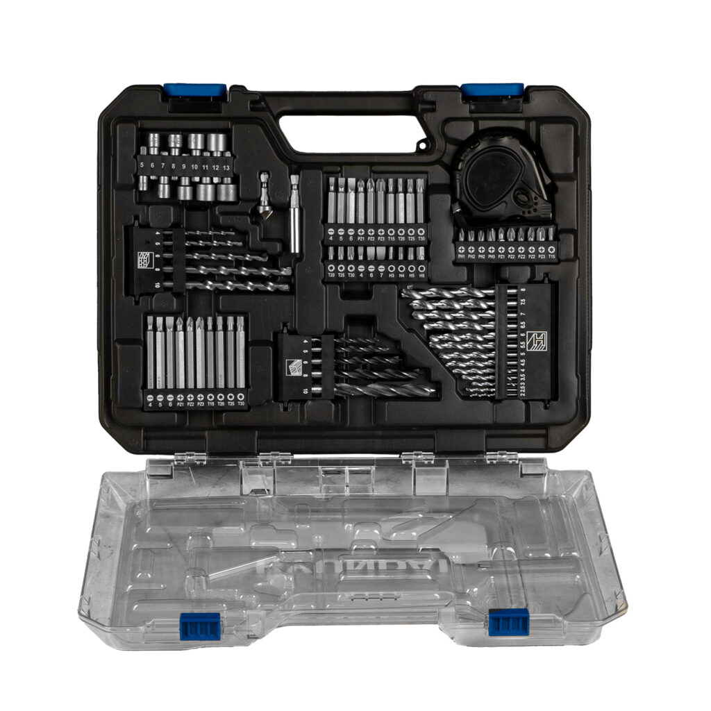 - 1 estuche con 75 accesorios, 1 batería 20v 2Ah, 1 cargador de 2A y 1 clip para cinturón.