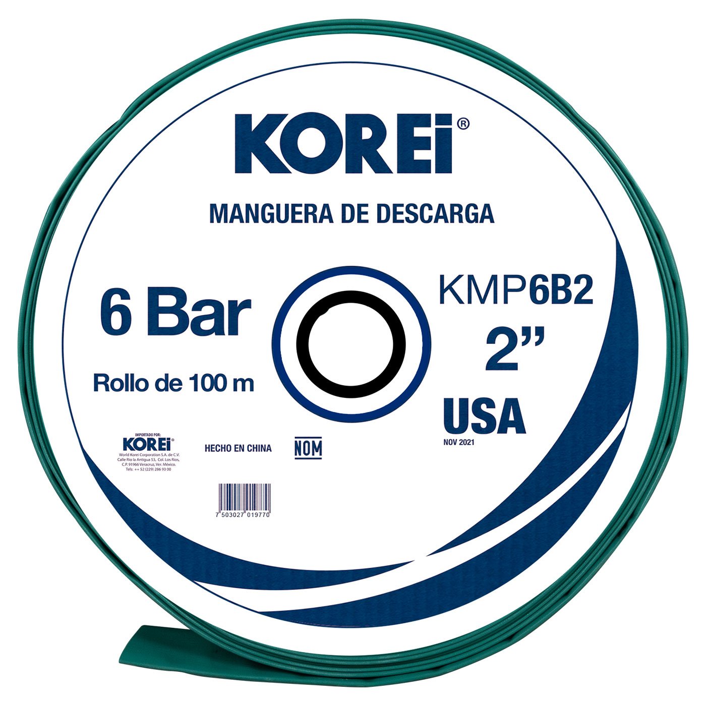 Manguera plana de descarga de 100 metros marca KOREI con medida de 2″ y resistencia de 6 Bar (Kilos de presión).