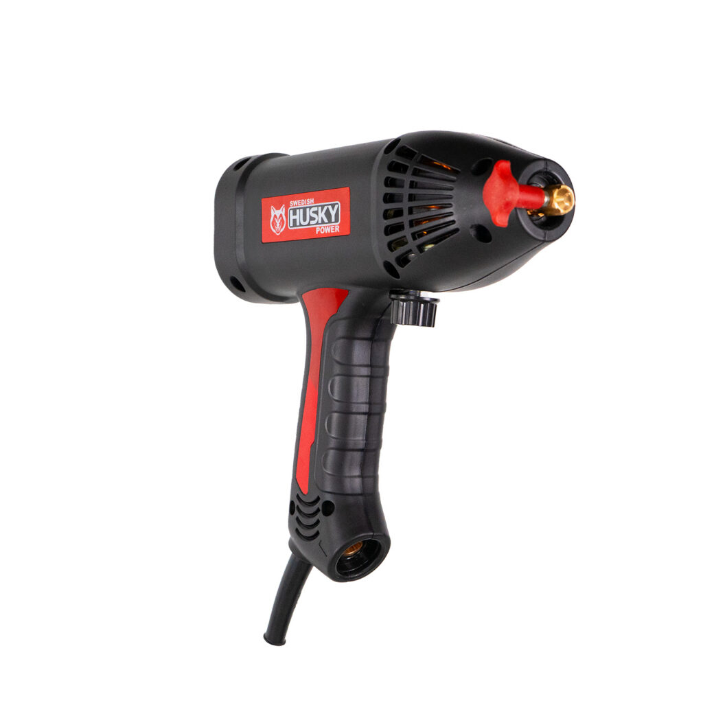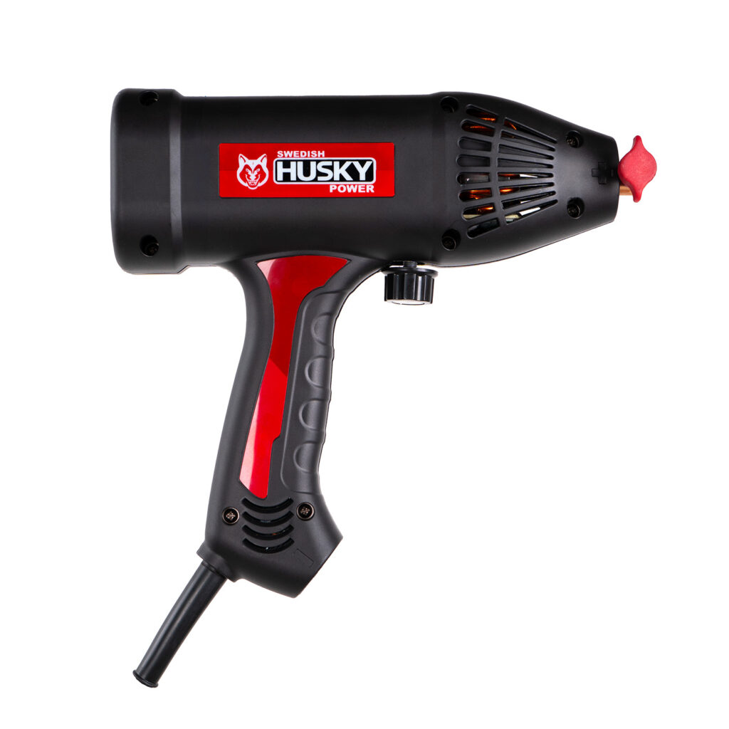 Pistola para soldar semiprofesional con tecnología IGBT marca SWEDISH HUSKY POWER. Fácil ajuste con perilla de corriente. Con sistema de refrigeración de alta eficiencia.